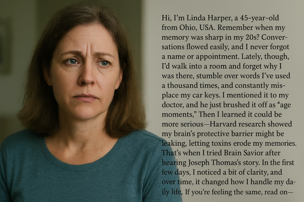 Hi, I’m Linda Harper, a 45-year-old from Ohio, USA. Remember when my memory was sharp in my 20s? Conversations flowed easily, and I never forgot a name or appointment. Lately, though, I’d walk into a room and forget why I was there, stumble over words I’ve used a thousand times, and constantly misplace my car keys. I mentioned it to my doctor, and he just brushed it off as “age moments.” Then I learned it could be more serious—Harvard research showed my brain’s protective barrier might be leaking, letting toxins erode my memories. That’s when I tried Brain Savior after hearing Joseph Thomas’s story. In the first few days, I noticed a bit of clarity, and over time, it changed how I handle my daily life. If you’re feeling the same, read on—it might be the start of your turnaround.
